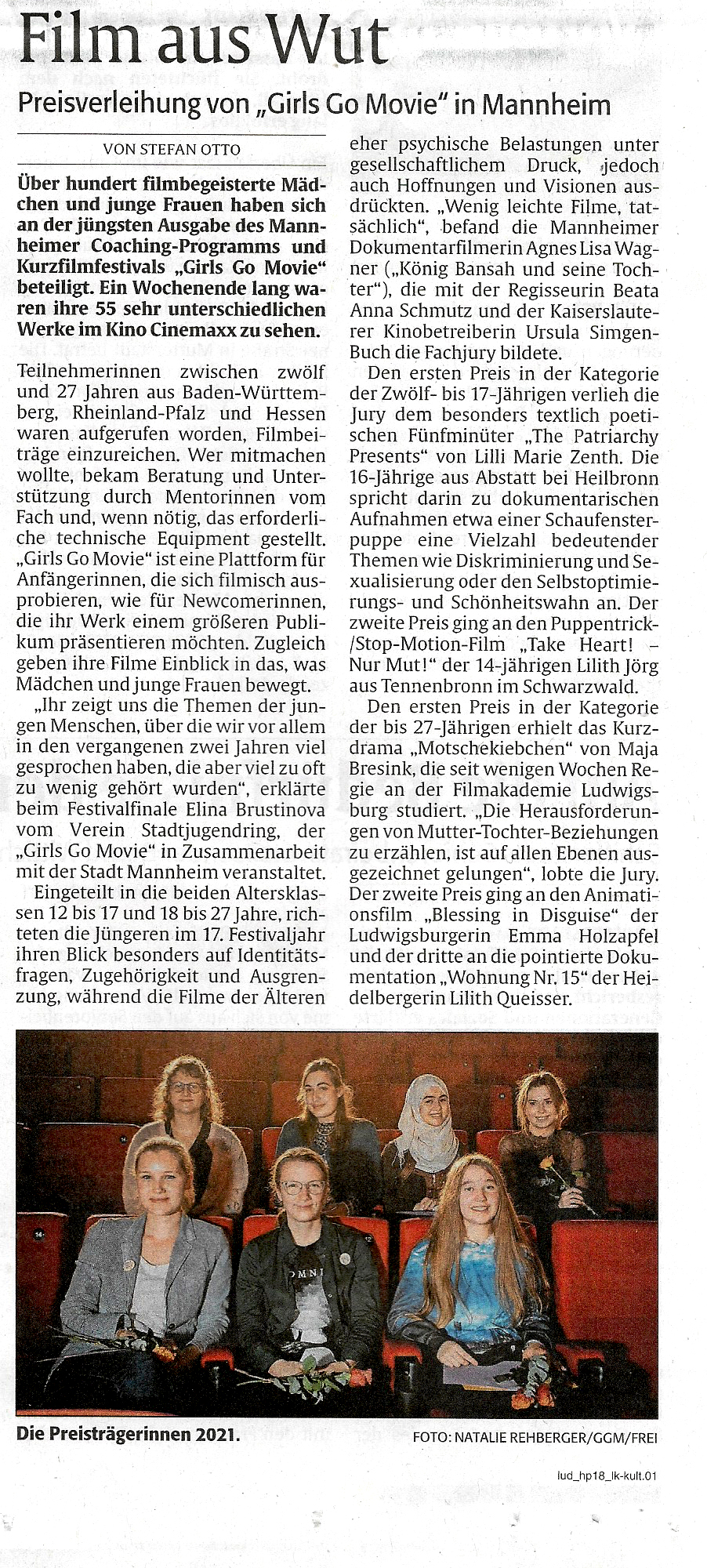 Gewinnerinnen von GIRLS GO MOVIE stehen fest – Mannheimer Morgen November 2023 (Download PDF)